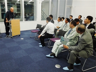 田老地区海岸災害復旧事業の現場では、東日本大震災による田老地区の被害及び復旧状況等の概要説明を受けた後、質疑応答が行われました。(写真3)