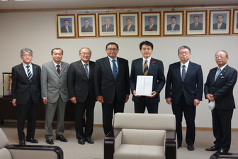 副議長は、国道101号整備促進期成同盟会等からの国道101号及び西津軽能代沿岸道路の整備促進に関する要望活動に応対しました。国道101号整備促進期成同盟会の齊藤会長(秋田県能代市長)、平田副会長(鰺ケ沢町長)等から要望書が提出された後(写真)、要望内容の説明を受け、意見交換を行いました。