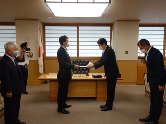 青森県漁港漁場協会の船橋代表理事、成田理事及び米田監事から要望書が提出された後(写真)、要望内容の説明を受け、意見交換を行いました。