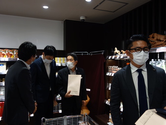 青森県大阪情報センター、青森・岩手えぇもんショップでは、県内事業者の製品販売及び観光情報の発信による誘客の促進等の取組について説明がありました。説明・質疑応答後は、青森・岩手えぇもんショップの視察を行いました。(写真1・2)
