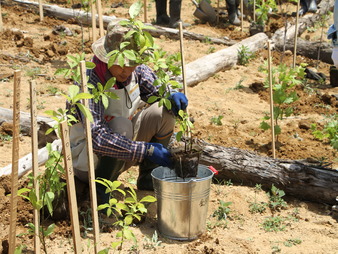 5日は社員60名、6日は社員やその家族38名、さらに田子町民の方13名が参加。2日間で5,000平方メートルの植樹エリアに地元田子町の山林から採取・栽培されたブナ、ミズナラ、ヤマザクラ、グミ、ヤマツツジなど27種類、計3,000本の苗木を植えました。