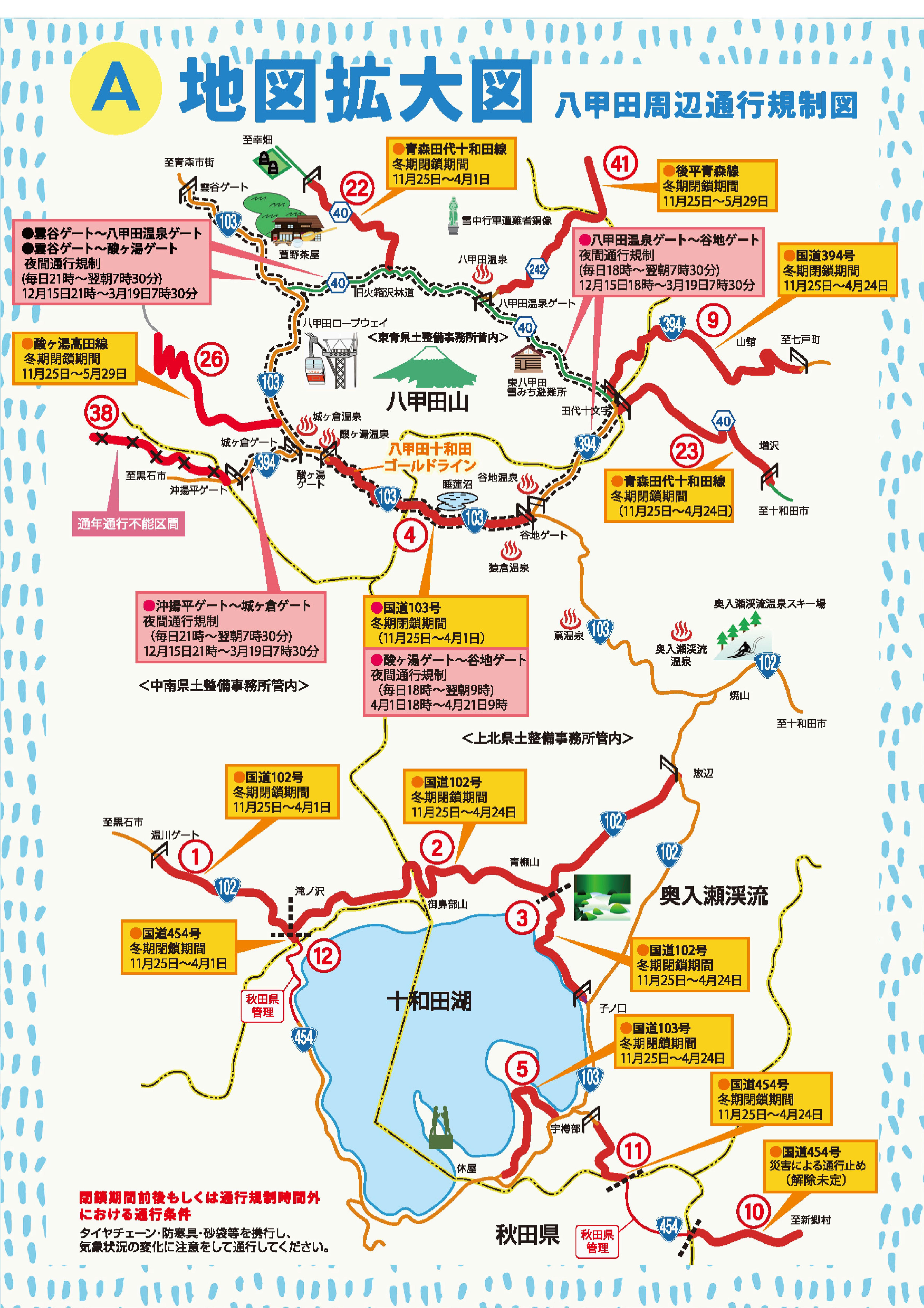 冬期閉鎖前でも、一時的な降積雪により通行止めを実施する場合がありますので、みち情報や交通情報を確認のうえ通行してくださるようお願いします。