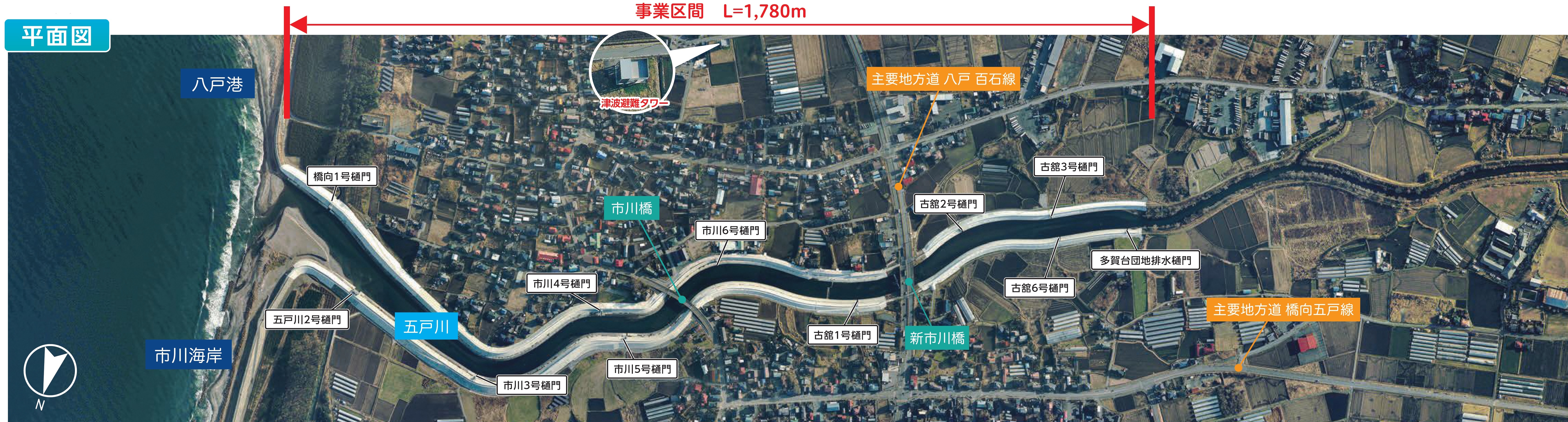 事業内容:築堤 L=3,490m(右岸 L=1,780m、左岸 L=1,710m)
