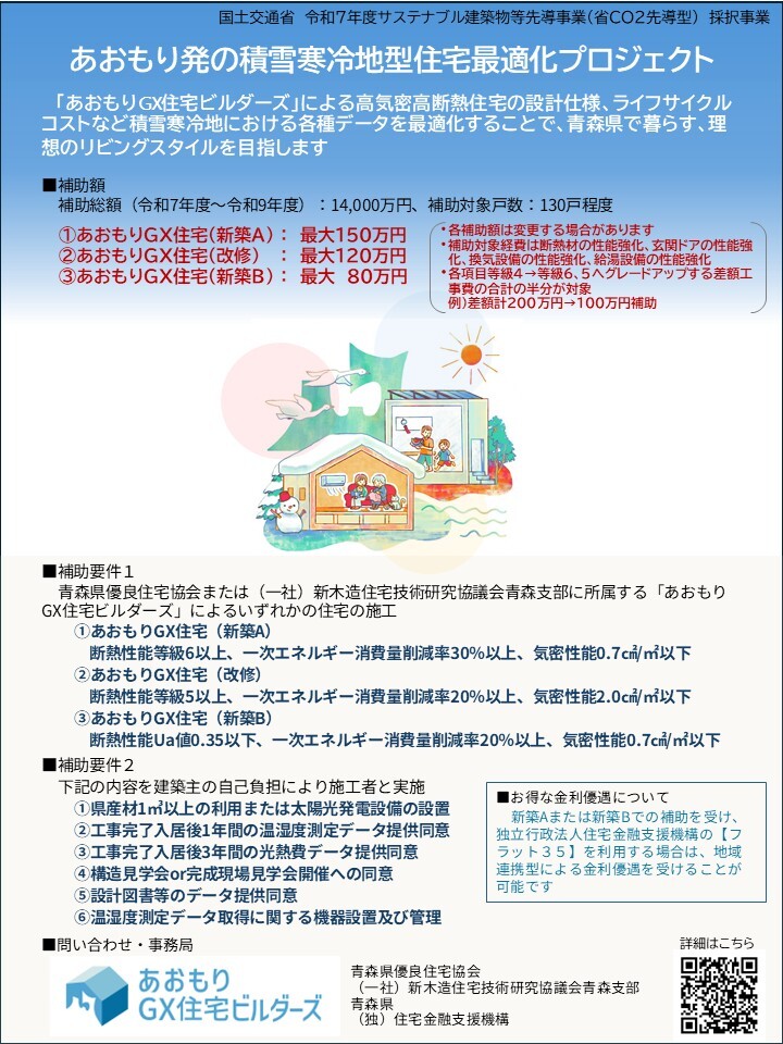 青森県とあおもりGX住宅ビルダーズ参画者である青森県優良住宅協会及び一般社団法人新木造住宅技術研究協議会が連携し提案した、積雪寒冷地を青森県から脱炭素で持続可能な住まいの暮らしを目指す「あおもり発の積雪寒冷地型住宅最適化プロジェクト」について、国土交通省令和7年度サステナブル建築物等先導事業(省CO2先導型)戸建住宅/一般部門(新築)において、採択されました