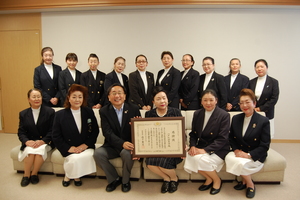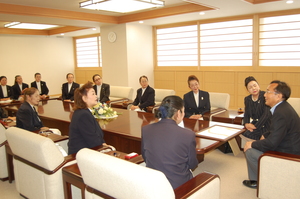 7月17日、長年にわたり全国の矯正施設への慰問活動を行っている功績に対して、法務大臣から感謝状を贈呈された八戸朳(えんぶり)研賛会が三村知事を訪問しました。