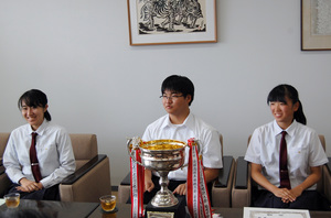 和嶋教育長は、「皆さんがこれまで努力してきた結果であるとともに、先生方、家族の方々等の支えがあってとれた賞だと思います。全国大会という場で自分の力を出すことができた、厳しいことを乗り越えられたという経験は、これからの人生にプラスになるので、これからもさまざまなことに向かっていってほしいと思います。」と激励しました。
