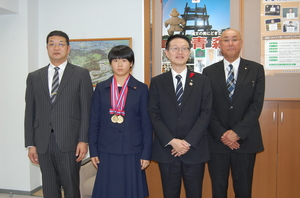 11月14日、第8回世界ジュニア女子相撲選手権大会において、個人戦中量級及び団体戦で優勝した木造高等学校相撲部の長谷川 理央(はせがわ りお)さんが和嶋教育長を訪問しました。