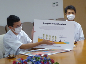 生徒たちは、日本伝統の土壌を固化する技術「三和土(たたき)」を応用した集水方法についての研究内容を説明し、「これまでの実験が報われて嬉しい」と、受賞の喜びを語りました。
