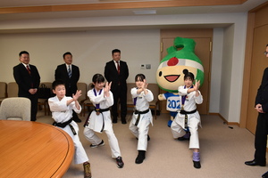 令和7年2月12日 船越義珍杯第16回少年・少女世界空手道選手権大会で優秀な成績を収めた選手が、宮下知事を訪問しました。