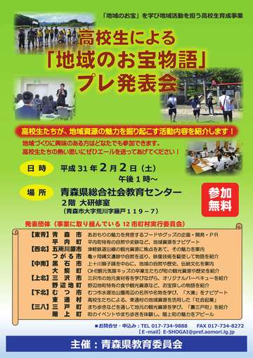急激な人口減少と少子高齢化の進行、高校卒業時の県外流出が懸念される中、地域への愛着と誇りを持って地域活動に参加し、その魅力を案内・発信できる高校生の育成を目的とした標記事業において、各市町村実行委員会が今年度取り組んできた「地域のお宝物語」の企画内容を発表するとともに、代表の高校生の交流の場とする。