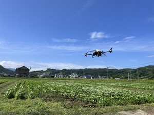スマート農業の導入に向けたドローンでの薬剤散布の実証実験を行い、大規模に営農する農事組合法人にしめやの今後の作業効率化と収量の安定化、品質の向上を目指しています。