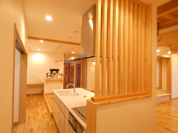 対の大黒柱や曲がりのあるアカマツの梁により開放感と安心感を与える設計となっており、プレカットと手刻みの併用でコスト低減が図られるなど、施主さまの希望を叶え、木に囲まれた空間を実現した点が評価され、木づかい賞に選出されました。