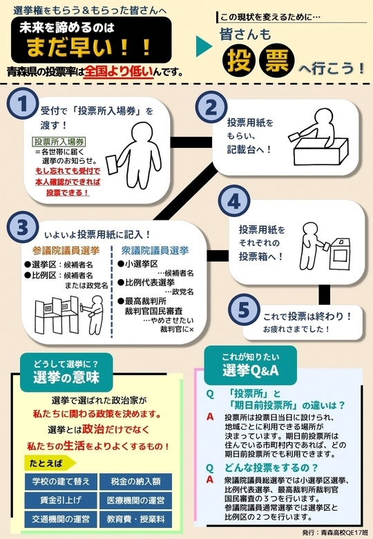 (ポスターを作成した 青森高校75回生 太田優希さん、小林一蓮さん、工藤飛和さん からのメッセージ)総合的な探究の時間の一環で作成しました。このポスターを見て、青森県の皆さんに積極的に投票へ行ってほしいと思います。未来を諦めるのはまだ早い! 私たちの生活をよりよいものにするために、ぜひ選挙に行きましょう!